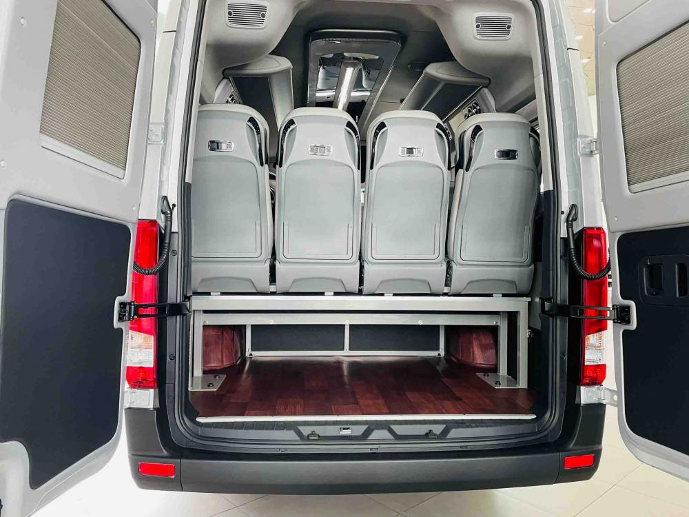 Ở phía sau, đuôi xe vuông vức và đồ sộ nhờ chiều cao khủng nhất phân khúc. Cửa sau có cấu trúc mở sang 2 bên giúp việc chất dỡ hành lý trở nên dễ dàng hơn. Cụm đèn hậu trên mẫu minibus có thiết kế hiện đại tích hợp đèn báo rẽ đặt theo phương thẳng đứng, vừa tầm quan sát giúp phương tiện phía sau dễ dàng nhận diện.