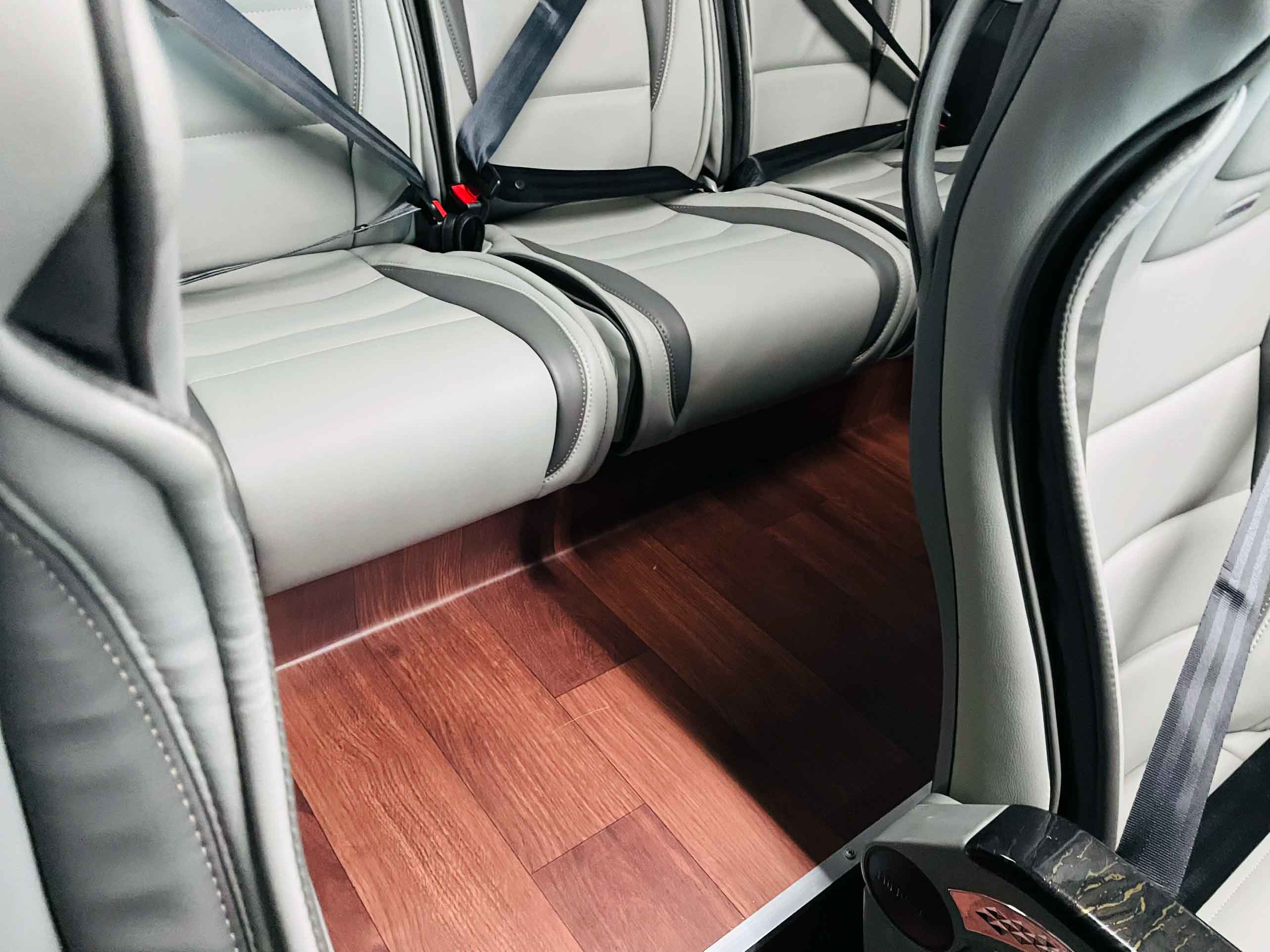 Sàn xe được phủ lớp simili vân gỗ cao cấp, chống nước tốt và dễ dàng vệ sinh. Bộ ghế Limousine có chất liệu bằng da mềm mại, êm ái tạo cảm giác dễ chịu cho khách hàng. Tông màu be chủ đạo làm nổi bật không gian nội thất bên trong xe. Ghế có tựa tay, có thể điều chỉnh độ nghiêng để tạo ra tư thế ngồi ưa thích, chỗ để chân khá rộng giúp người ngồi luôn trong tư thế thoải mái nhất.